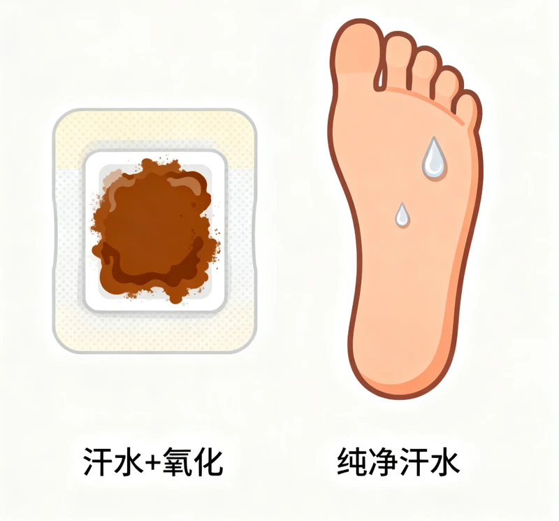 汗液中的尿素与足贴铁粉接触后氧化变深,部分产品添加的栀子黄等植物色素也会随pH值变化呈现黄褐色,易被误认为"毒素"沉积。